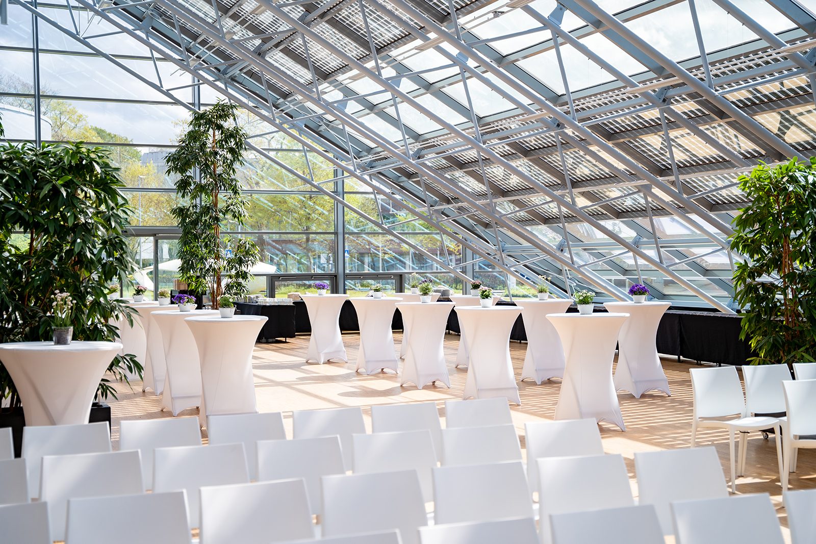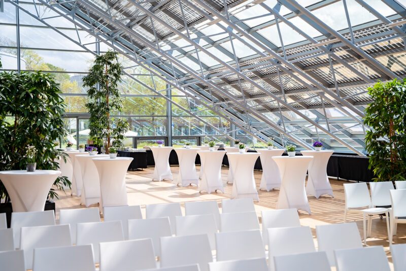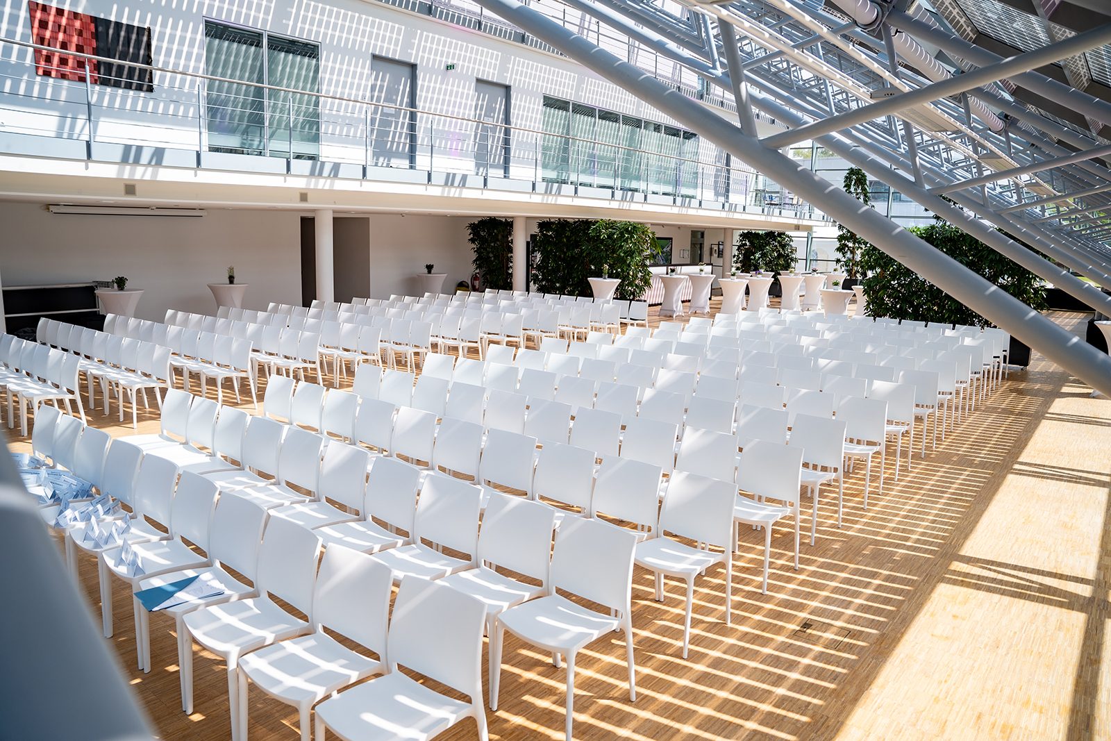 Für den offiziellen Teil der Veranstaltung haben wir den Raum mit hochwertigem Tagungsequipment ausgestattet und die Stühle in Konferenzanordnung aufgestellt. So konnten die Gäste die Präsentationen und Reden in einer angenehmen und professionellen Atmosphäre genießen.