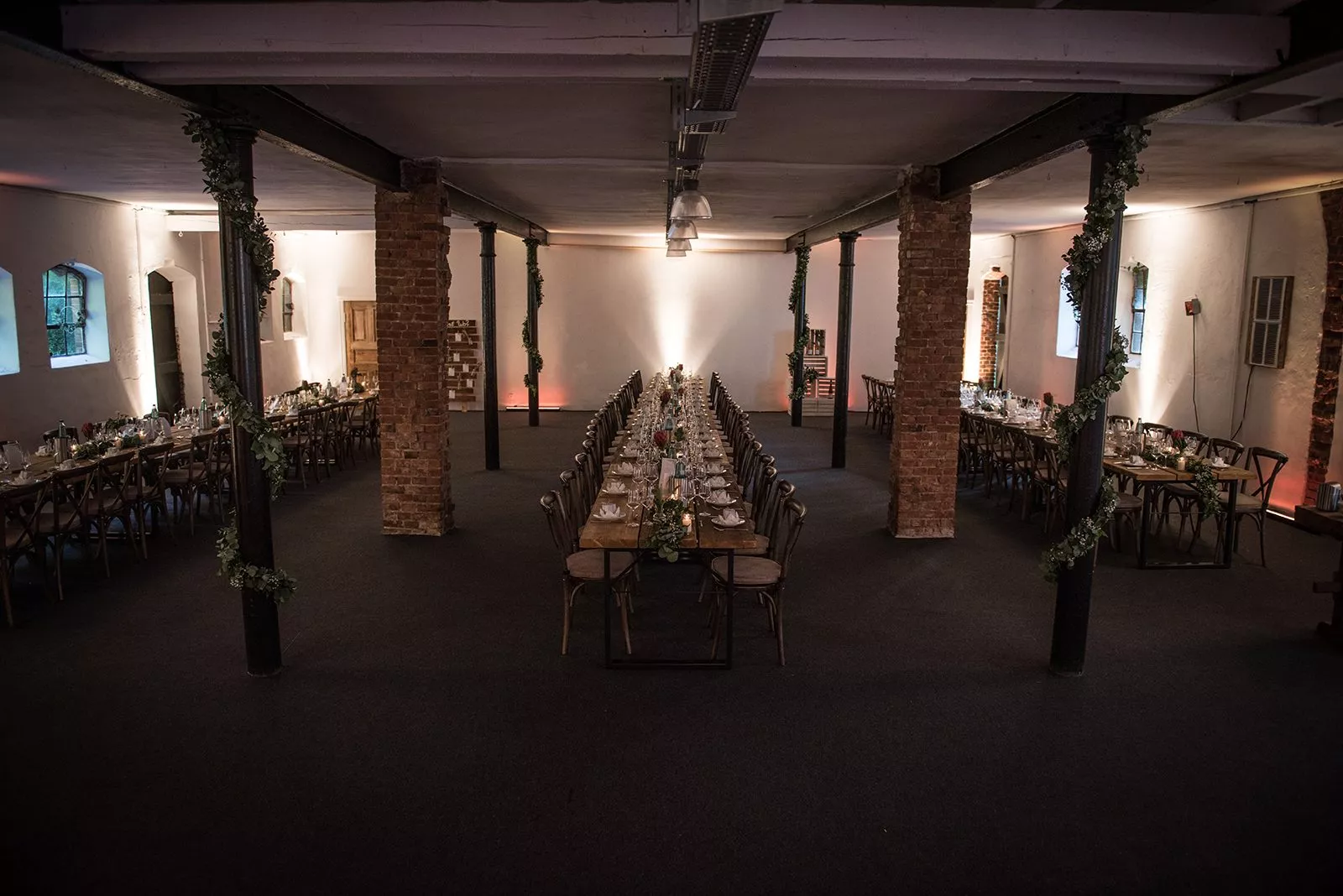 Die langen Holztische und Stühle fügten sich harmonisch in das Ambiente des Kuhstalls ein und strahlten eine warme, einladende Atmosphäre aus. Die schlichte Dekoration setzte elegante Akzente, ohne von der natürlichen Schönheit des Raumes abzulenken. Die Mischung aus rustikalem Charme und feiner Eleganz machte diese Hochzeit zu etwas ganz Besonderem.