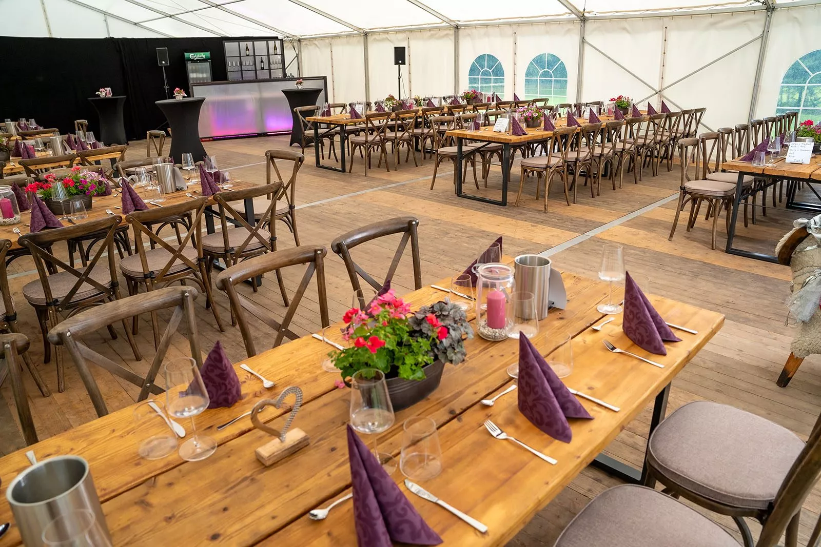 Im Zelt sorgten Holztische und -stühle für eine warme, einladende Atmosphäre, die den charmanten Charakter der Feier unterstrich. Die Dekoration war geschmackvoll auf den Anlass abgestimmt und verlieh dem Raum eine festliche, persönliche Note, die den Abend besonders machte.